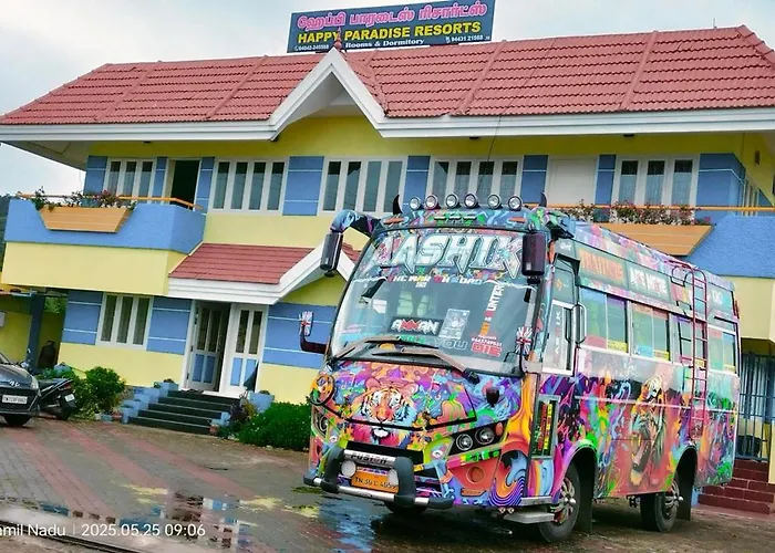 De accommodatie bij particulieren is gemakkelijk bereikbaar vanaf Madurai luchthaven, gelegen 140 km verderop. In Happy Paradise Resort worden een eettafel aan gasten aangeboden.